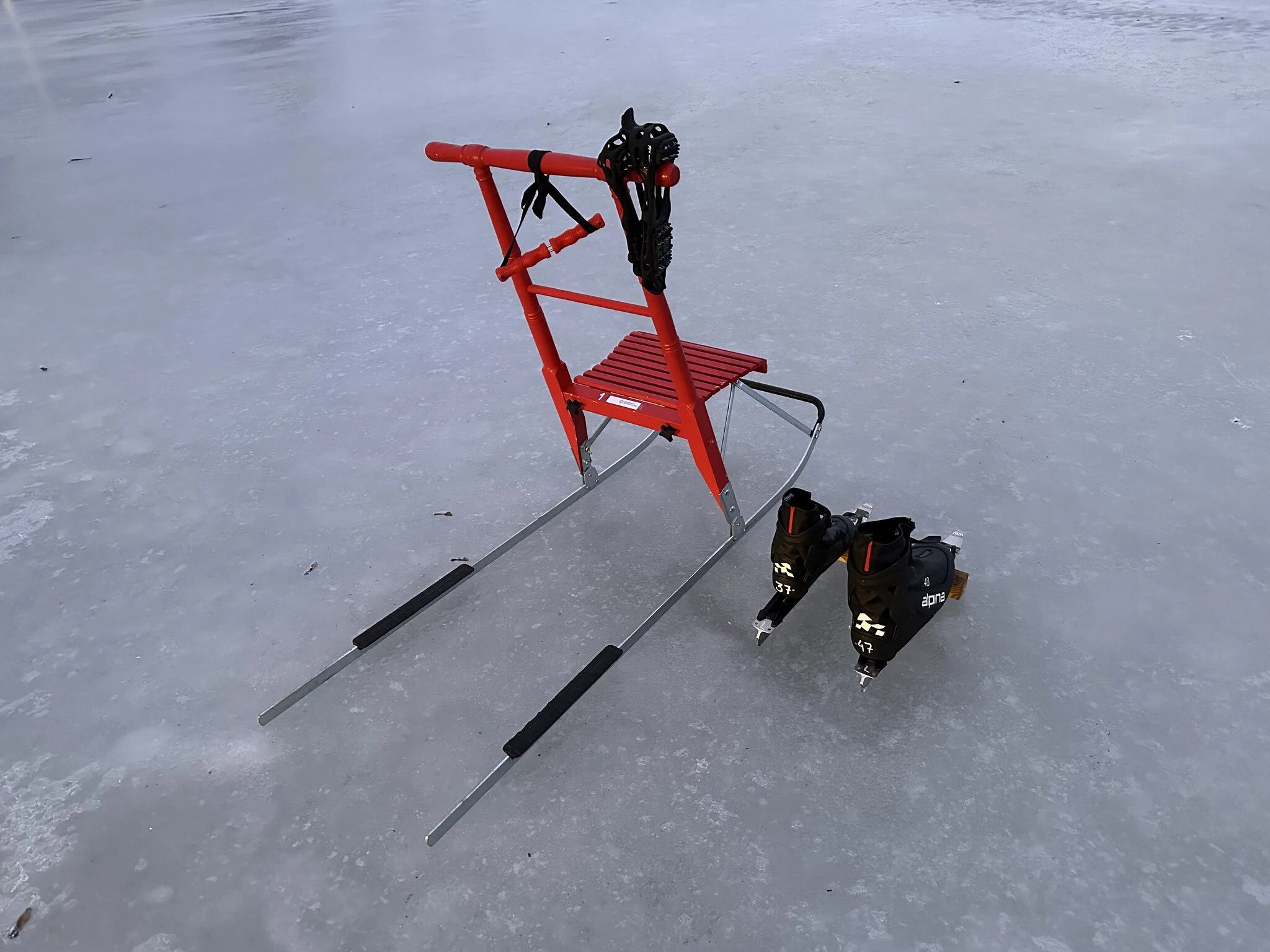 Potkukelkka + liukuesteet kenkiin + naskalit. Siniset kelkat + liukuesteet ovat kokoa XL/L, punaiset kelkat kokoa M/S.